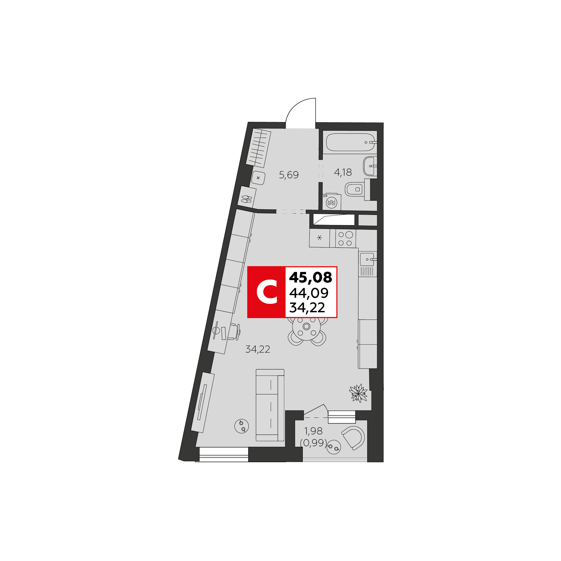 Общая площадь: 45.08м2