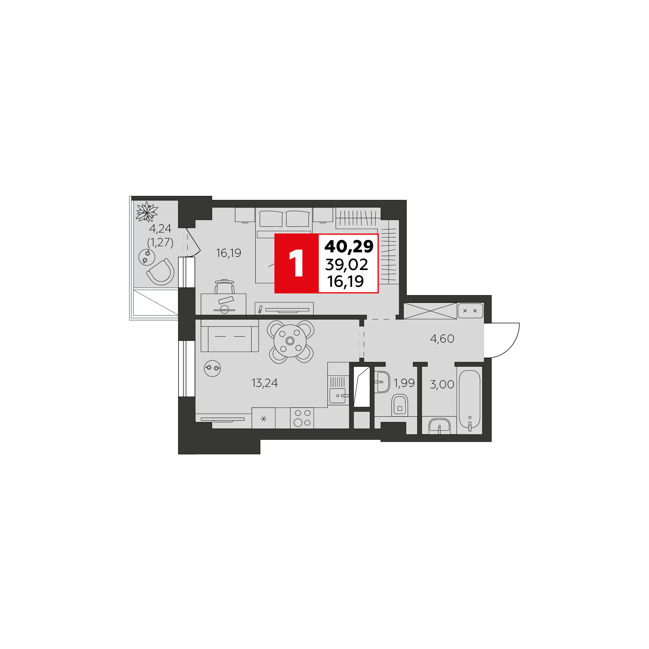 Общая площадь: 40.29м2