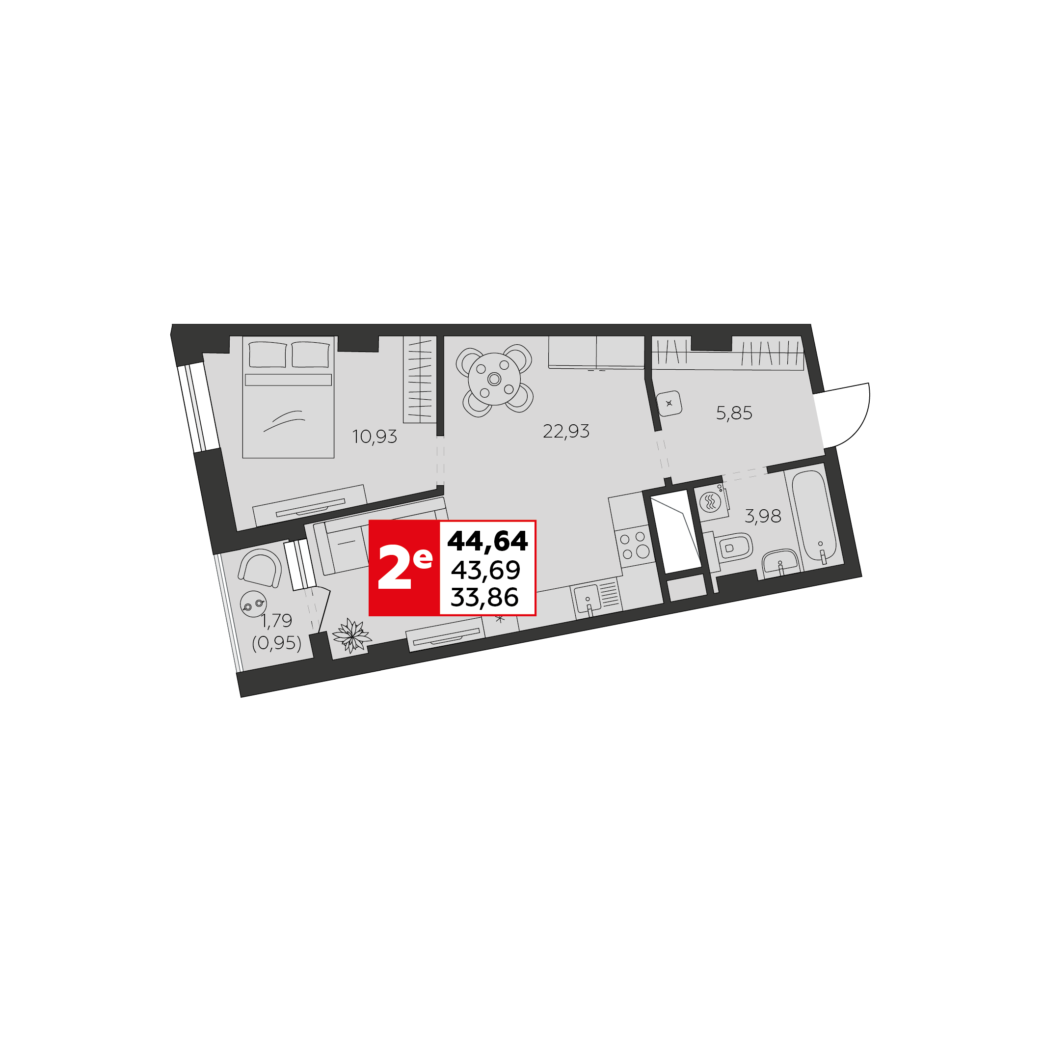Квартира этаж 22, площадь 44.64 м2