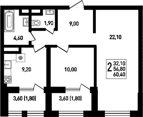 Общая площадь: 60.40м2
