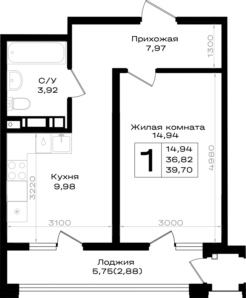 Общая площадь: 39.70м2