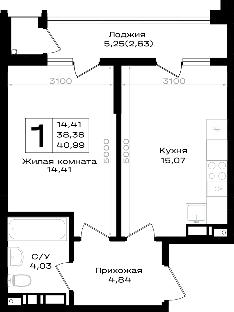 Общая площадь: 40.99м2