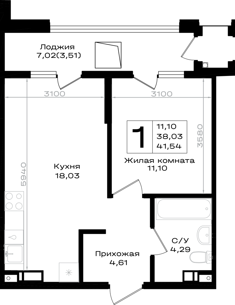 Общая площадь: 41.54м2