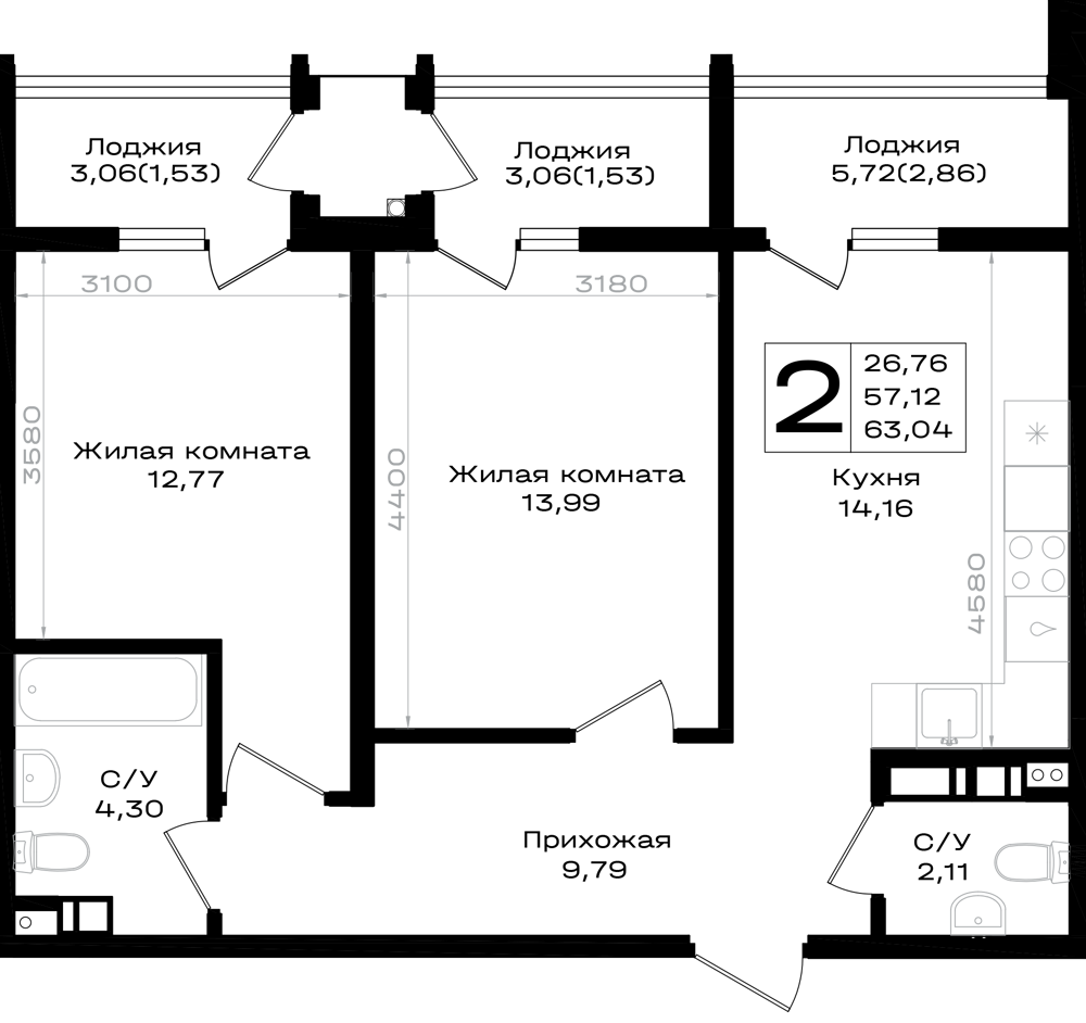 Общая площадь: 63.04м2