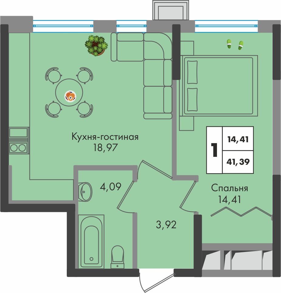 Общая площадь: 41.39м2