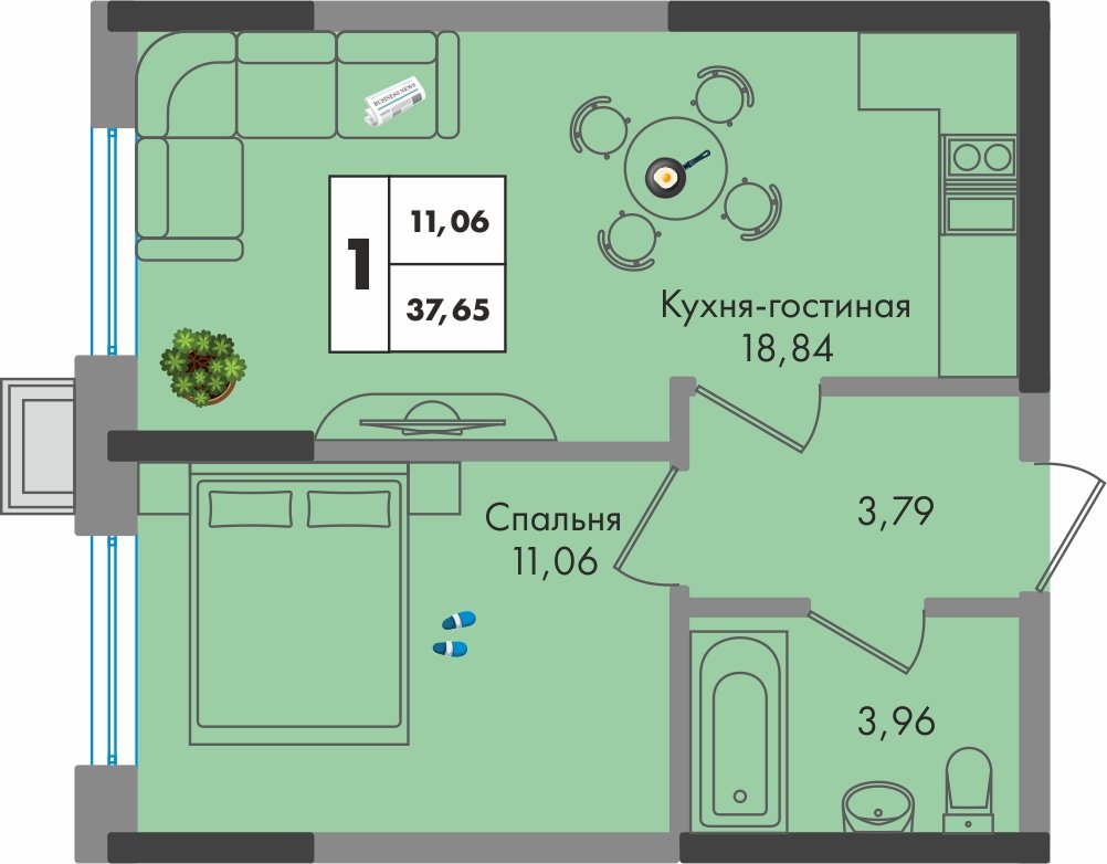 Общая площадь: 37.65м2