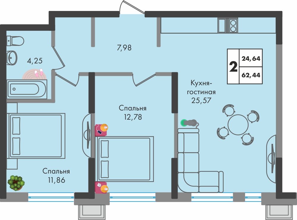 Общая площадь: 62.44м2